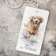 Keyring featuring a beautiful watercolor painting of a Golden retriever running through water and customizable text, for example a name.