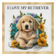 Wunderschönes Watercolor Golden Retriever Welpendesign mit gelben, lila und blauen Blumen und goldenem Rahmen