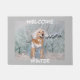 Diese Türmatte ist mit einem goldenen Retriever verkleidet, der als Wintermärchen verkleidet ist und im Schnee sitzt und einen Zauberstab hält, der den Winter aussagt. Der Text lautet "WILLKOMMEN WINTER".