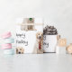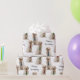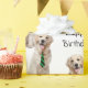 Niedliche Golden Retrievers mit gestreiften Krawatten und Happy Birthday Text auf weißem Hintergrund. Die Hintergrundfarbe kann geändert werden.
