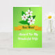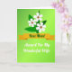 This greeting card features a smooth green gradient background that shifts from bright lime to deeper emerald, setting a fresh, gentle mood. Near the top, three white stylized flowers with small warm-brown centers sit among dark green leaves, leaning close together like a quiet sign of affection ❤️. Across the middle, a golden-ochre ribbon banner stretches horizontally, adding a warm contrast to the cool greens. Centered on the banner is a short line of deep green lettering, placed neatly to stand out against the gold. Below the ribbon, a second line of white flowing lettering appears, spaced with room to breathe and giving the layout a soft, intimate feel 🌼. The flowers and foliage frame the words without crowding them, guiding your eyes from the blossoms down to the message. Subtle highlights in the background add a light glow that makes the greens feel layered rather than flat. The three blossoms are clustered in the upper section, with their petals outlined in white against the deep green leaves.
