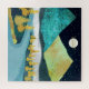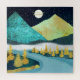 Eine wunderschöne Landschaft mit einzigartigen Texturen, die eine Fluss- und Berglandschaft mit aufsteigendem Mond und Sternenhimmel in den Farben Blau, Gold, dunkelgrün und Gelb zeigen.