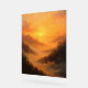 Das ist ein atemberaubendes Landschaftsbild, das ein Bergtal darstellt, das im intensiven, strahlenden Licht eines Sonnenaufgangs oder Sonnenuntergangs gebadet wird. Der Himmel wird von einem leuchtenden goldenen und orangefarbenen Glühen beherrscht, das von der Zentralsonne strahlt und die verstreuten Wolken erhellt. Die Szene ist tief, bewaldet, auf beiden Seiten, ihre Silhouetten bieten einen dramatischen Kontrast zum lebhaften Himmel. Ein dicker, ätherischer Nebel oder Nebel füllt den Talboden und schafft ein Gefühl von Tiefe, Geheimnis und Ruhe. Der Stil ist sehr atmosphärisch und erinnert an die Grandeur der Natur, was einen traditionellen oder romantischen Realismus in der Malerei nahe legt.