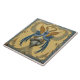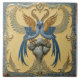 Zwei blaue Vögel mit goldenen Flügeln auf einem Felsen, gelber Hintergrund mit blumengeschmückten Ornamenten, Vintager Stil, quadratische Kacheln.