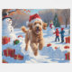 Ein flauschiger Goldendoodle läuft spielerisch durch die schneebedeckte Winterszene und trägt einen festlichen roten Weihnachtshut. Dieses lebendige Design hebt das frische Fell der Rasse, die liebevolle Natur und die fröhliche Persönlichkeit hervor und erweckt den fröhlichen Geist der Urlaubssaison. Ein herzlicher Wintergenuss voller festlichen Charme.