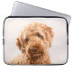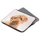 Ein Studioportrait eines goldenen Doodle Hundes, der die Kamera anschaut.