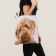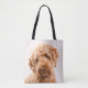 Ein Studioporträt eines goldenen Doodle-Hundes, der die Kamera anschaut.