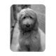 Ein bezaubernder Zorn Goldendoodle Welpe sitzend auf einem Hinterhof Beton Spaziergang entlang einer Ziegelwand in Schwarz-Weiß.