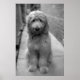 Ein bezaubernder Zorn Goldendoodle Welpe sitzend auf einem Garten Beton entlang einer Ziegelwand in Schwarz-Weiß.