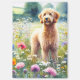 Ein reizendes Aquarelldesign mit einem lieblichen Goldendoodle Hund, stehend in einem lebendigen Feld von Wildblumen. Die sanften Pinselstriche und die bunten Blüten schaffen eine ruhige und fröhliche Szene und machen dieses Geschenk zu einer perfekten Mischung aus Natur und Hauch.