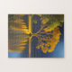Ein goldener Baum spiegelt sich in einem mondbeleuchteten See wider.
