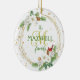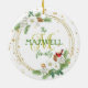 Dieses hübsche Ornament besticht durch einen vergoldeten Kranz mit zwei Haufen weißer Beeren, Petunien, Heilige und Kiefernäste, Kiefernhäuten und Vintagen Viktorianischen Ornamenten, die von oben hängen. Ein roter Kardinal sitzt auf einer Petunia und versucht, auf dem Pinecon zu nibbeln. Personalisieren Sie das Zentrum mit Ihrem Monogramm und Familiennamen. Goldene Sterne blicken umher und tragen so zur Eleganz dieses Weihnachtsschmucks bei. Perfekt für Geschenke, die an einen Freund oder Mitarbeiter gegeben werden. Das Design ist auf der Rückseite gleich, es ist also egal, ob es sich um den Baum dreht!