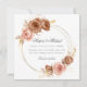 Elegante Hochzeitseinladung mit einem Champagner-Thema, mit schokoladenbraunen und rot-rosa Rosen in einem modernen Kranz arrangiert. Akzentuiert mit goldgeprägten Imitationsstiften, Blätter, Blattwerk und Spatter. Bitte beachten Sie, dass die Golddetails in dieser Hochzeitseinladung eine Imitation von Gold mit Prägung sind.