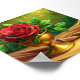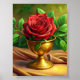Eine auffallende rote Rose liegt elegant in einer goldenen Vase, die mit ihren lebhaften Blütenblättern eine Leidenschaft und Schönheit ausstrahlt. Die Vase strahlt mit einem warmen Licht, das Licht reflektiert und die Blume in ihrer Farbe verstärkt. Die Rose ist von üppigen grünen Blätter umgeben, die dem lebhaften Rot einen erfrischenden Kontrast verleihen. Die goldene Tischdecke darunter schafft eine luxuriöse Kulisse, die sanft schimmert und die Brillanz der Rose ergänzt. Diese Komposition strahlt Wärme und Opulenz aus und ruft in jedem Rahmen ein Gefühl von Romantik und Grandeur hervor.