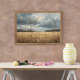 Ein evokatives Ölgemälde, das die ruhige Schönheit eines großen goldenen Feldes, möglicherweise Weizen oder großen Gras, in einen fernen Horizont einnimmt. Der Vordergrund wird von detaillierten Stalks dominiert, die sanft schweben und den Betrachter in die Szene gezeichnet haben. Oben deutet ein dramatischer Himmel mit schweren, dunklen Wolken auf einen sich nähernden Sturm hin, im Kontrast zu Taschen von weichem Licht, die durchbrechen. Dieses Kunstwerk verbindet die Ruhe der Natur mit dem rohen Power der Elemente, in einem strukturierten, malerischen Stil.