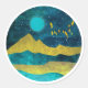 Abstraktes Gebirgslandschaftsdesign in kühnen Goldtönen, Zyantönen und Blau mit einem Mondschein, Sternen und Vögeln.