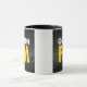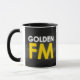 Weiße u. schwarze Tasse mit goldenem FM Logo.