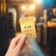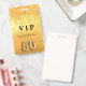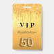 Ein modernes, stilvolles und glamouröses Abzeichen für eine 50. Geburtstagsfeier. Ein wackeliger goldener Hintergrund mit Imitat Glitzer Tropfen, Farbe tropfend aussehen. Der Name ist mit einem modernen handgeschriebenen Stilskript geschrieben. Mit dem Text: VIP Nummer 50 ist geschrieben mit einem ballon Stil Schriftart, Skript. Zurück: Datum des Party und der Veranstaltungsadresse.