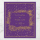 Goldener Kiefernrahmen mit Konen, Konfetti und grenzt lila Winter Weihnachtsweinlabel. Ein wunderschönes Hochzeitsdesign mit einem goldenen Kiefernrahmen mit Kegel und Nadeln und goldenen Konfetti-Rahmen auf lila Hintergrund.