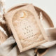 Ein leuchtendes himmlisches Design mit zarten Halbmonden und verstreuten Sternbildern vor einem warmen Pergamenthintergrund. Ein raffinierter goldener Rahmen umgibt die Komposition, während elegante Schrift-Typografie einen eleganten Mittelpunkt schafft, der eines so bedeutenden Meilensteins würdig ist. Die sanften Elfenbein- und Champagnertöne verleihen dem gesamten Stück einen zeitlosen, strahlenden Glanz. Perfekt für eine Quinceañera-Feier, die romantisch, erhaben und vom Sternenlicht berührt wirkt.