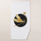 Künstlerisch bemalt, Gold, Schmuck, funkelnde Libelle mit detailreichen filigranen Flügeln auf goldener wilder Blume, gegen schwarz strukturierte Kreis. Goldene Libelle