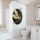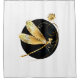 Künstlerisch bemalt, Gold, Schmuck, funkelnde Libelle mit detailreichen filigranen Flügeln auf goldener wilder Blume, gegen schwarz strukturierte Kreis. Goldene Libelle