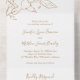 Elegante Line Art All In One Wedding Einladung mit einem einfachen Stift Skizze einer magnolischen Blume in einem Imitat Gold über einem weißen Hintergrund. Diese schöne Blumeneinladung eignet sich hervorragend für eine Hochzeit im Frühling oder Sommer.