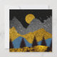 Abstraktes Berglandschaftsdesign in kühnen Goldtönen, Schwarz und Blau mit Mondschein und Vögeln.
