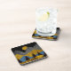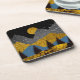 Abstraktes Berglandschaftsdesign in kühnen Goldtönen, Schwarz und Blau mit Mondschein und Vögeln.