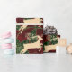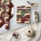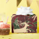 Dieses wunderschöne Verpackungspapier hat ein Vintages Gefühl: altmodische extravagante Goldrinder springen über ein stilisiertes, grün und dunkelrotes, botanisches Imitat-Tapete. Der Hintergrund erinnert an Vintage Textilmuster aus der Jugendstil-Zeit mit einem simulierten Brokat- oder Damast-Gefühl.
