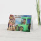 Diese Karte bietet goldene Retrievers als Bauer. Einer fährt den Traktor, während der andere das Heu einreißt. Der Text lautet "Hay, Hay! Es ist dein Geburtstag!" und "Hoffe, dass du Spaß hast!"