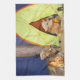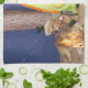 Dieses Küchentuch kennzeichnet goldene Retriever in einer Campingsszene. Ein golden retriever röstet Eibische durch das Feuer, während das andere Goldene heraus im Zelt hängt.