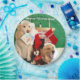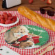 Diese Teller zeigen goldene Retrievers, die eine Weihnachtsgeschichte am Heiligen Abend am Feuer lesen. Die Nachricht lautet: "Frohe Weihnachten!"