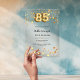 Eine moderne, stilvolle und glamouröse Einladung zu einer 85. Geburtstagsfeier. Ein klarer, transparenter Hintergrund mit goldenen Imitaten. Der Name ist mit einem handgeschriebenen Stilskript geschrieben. Personalisieren Sie Ihre Party-Daten und fügen Sie sie hinzu. Nummer 85 wird mit einem Schriftart im Ballonstil geschrieben, Skript.