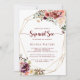 Diese goldene geometrische Sommerblumenschlucht und die Einladung ist perfekt für eine einfache Begegnung mit dem Baby-Party. Die Blume sind bordeauxrot, rosa und rot, das Wasser ist mit grünen Blätter in einem bräunlichen Hintergrund.