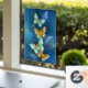 Zusammensetzung aus Fliegen, Schmuck, Gold und dunklen Schmetterlingen auf texturiertem Schmuckhintergrund. Goldener Schmetterling.