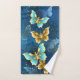 Zusammensetzung aus Fliegen, Schmuck, Gold und dunklen Schmetterlingen auf texturiertem Schmuckhintergrund. Goldener Schmetterling.