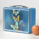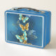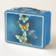 Zusammensetzung aus Fliegen, Schmuck, Gold und dunklen Schmetterlingen auf texturiertem Schmuckhintergrund. Goldener Schmetterling.