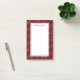 Sticky Noten mit einem sich wiederholenden Muster von extravaganten goldenen Schneeflocken mit eleganten kristallinen Formen. Ein dunkelroter Hintergrund.