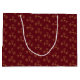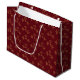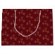 Eine große Geschenktasche mit einem sich wiederholenden Muster extravaganter goldener Schneeflocken mit eleganten kristallinen Formen. Ein dunkelroter Hintergrund.