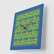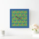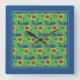 Eine helle, attraktive quadratische Wall-Uhr, mit einem Muster aus goldgelben Sonnenblumen auf tiefblauem Hintergrund, von einem Screenprint von Judy Adamson.