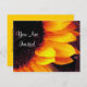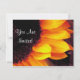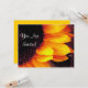 Eine lebendige goldene Sonnenblume steht auf der Vorderseite dieses Blumenzettel-Design zusammen mit dem Text Sie sind eingeladen. Sie können den Wortlaut, die Textfarbe oder den Stil des Schriftartes auf dieser Vorderseite und hinten ändern. Sie können auch die Hintergrundfarbe auf der Rückseite der Einladung ändern.