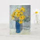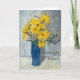 Eine hübsche Geburtstagskarte mit "Happy Birthday" in Walisisch und eine blaue Vase goldgelber Sonnenblumen, aus einem Ölpastellbild von Judy Adamson.