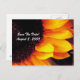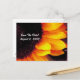 Eine lebendige goldene Sonnenblume kündigt eine Hochzeit auf diesem blumengeschmückten Save the Date Design an. Sie können den Wortlaut, die Textfarbe oder den Stil des Schriftartes ändern. Sie können auch die Hintergrundfarbe auf der Rückseite ändern.