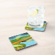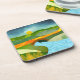 Abstrakte Landschaft eines Flusses unter einer Steinbrücke mit sanften Hügeln und einer goldenen Straße in kühnen Farben und Texturen.