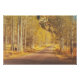 Eine kurvenreiche, schmale Straße erstreckt sich durch einen Wald von hohen, schlanken Aspen mit goldenen Blätter. Die Bäume reihen die Straße auf beiden Seiten ab und bilden einen Tunnel mit Herbstfarben. Das Sonnenlicht filtert durch die Blätter und wirft ein warmes Licht auf den Weg. Der Boden ist mit gefallenen Blätter bedeckt, was zu Ruhe und Schönheit beiträgt.