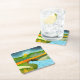 Abstrakte Landschaft eines Flusses unter einer Steinbrücke mit sanften Hügeln und einer goldenen Straße in kühnen Farben und Texturen.