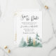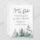 Inspiration Hochzeit Save the Date zeigt ein rustikales Waldland Aquarellbild mit eleganten glitzernden Gold- und grünen Kiefernbäumen. Auf der Rückseite ist das Lied der Bibel Verse von Solomon 3:4 zu sehen: "Ich habe das Eine in meinem Soul Lieben gefunden." Gute Wahl für Herbst, Winter und Weihnachten.