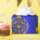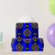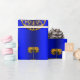 Eine dekorative Weihnachtsverpackung mit goldenen Weihnachtsdekorationen auf einem farbenfrohen, metallisch-blauen Hintergrund, um eine raffinierte und festliche Touch zu Ihrem Geschenk in dieser Urlaubssaison.