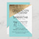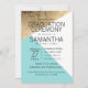 Elegante, moderne und schicke Imitat bedruckten Gold, Weiß und Pantone Limette Muschel blaue geometrische Dreiecke Muster, Abschluss Zeremonie Einladungen. Dieses klassische und anspruchsvolle Design ist perfekt für den anspruchsvollen, stilvollen und trendigen Absolventen. Personalisieren Sie mit Ihrer eigenen Nachricht auf der Vorderseite und einem angepassten Monogramm Initial auf der Rückseite. Das gesamte Foto-Druckdesign.